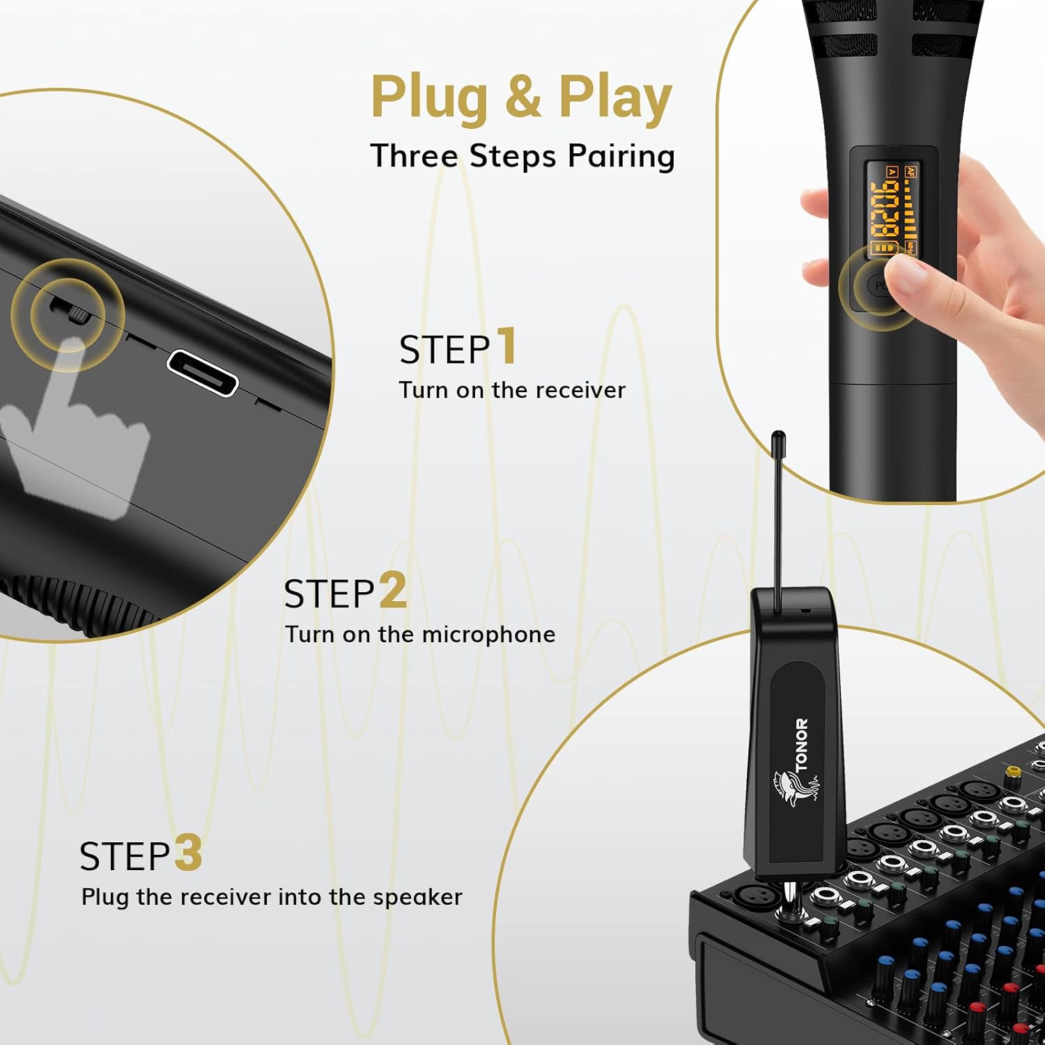 - Plug and Play: con su conector de micrófono inalámbrico de 0.250 in, nuestro receptor se conecta sin esfuerzo a varios dispositivos como máquinas de karaoke, altavoces, amplificadores, mezcladores e interfaces de audio. Nota: El dispositivo de salida DEBE TENER 0.250 in (1/4") interfaz MIC. No es compatible con teléfonos móviles, computadoras o tabletas.