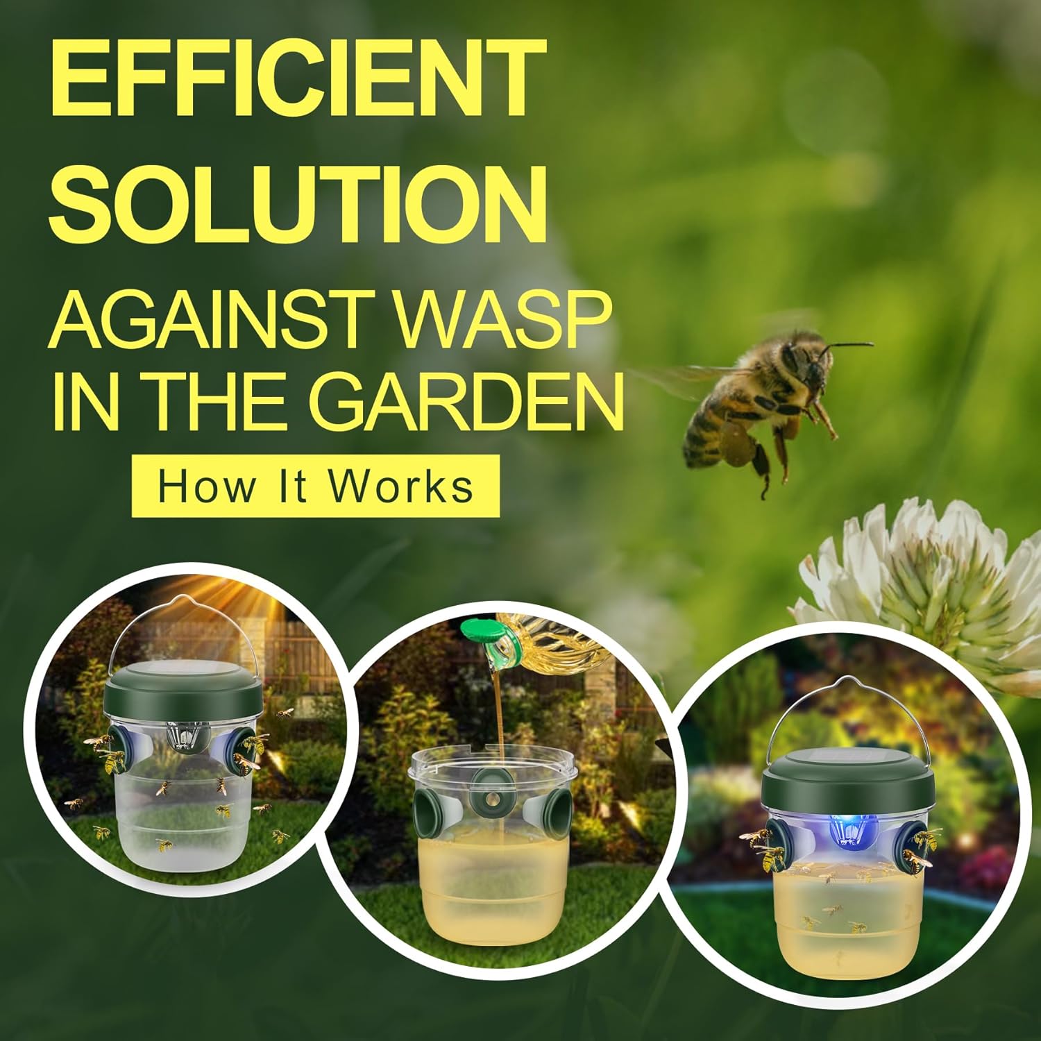 - Luz atrayente alimentada por energía solar para un control eficaz de avispas: La trampa para avispas cuenta con una luz atrayente alimentada por energía solar que se carga automáticamente durante el día y ayuda a atraer avispas, chaquetas amarillas, avispones y otras plagas. Esta solución ecológica utiliza luz natural para atraer insectos sin la necesidad de fuentes de energía adicionales, manteniendo tus espacios al aire libre de avispas.