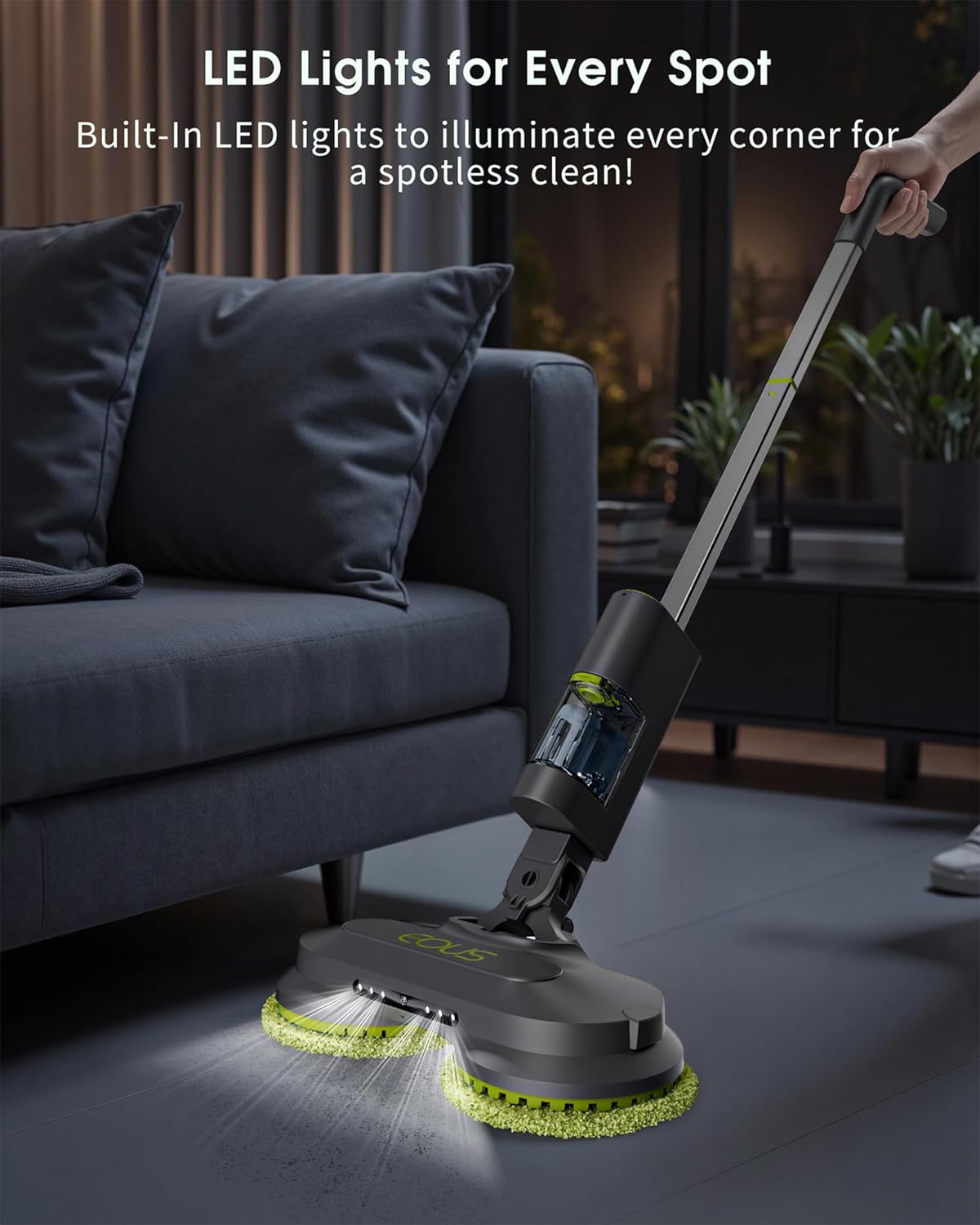 Luces LED para suciedad oculta: las luces LED incorporadas en esta fregona eléctrica iluminan las esquinas oscuras, lo que garantiza que no quede polvo ni suciedad.