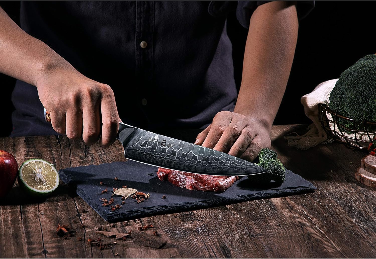 - Borde afilado: El borde es afilado a mano por herreros de cuchillos altamente calificados utilizando el método tradicional Honbazuke de 3 pasos, cada lado de la hoja se afila a 18 grados. Esta cuchilla afilada proporciona una eficiencia inigualable. ¡Tu trabajo en la cocina se realiza en poco tiempo!