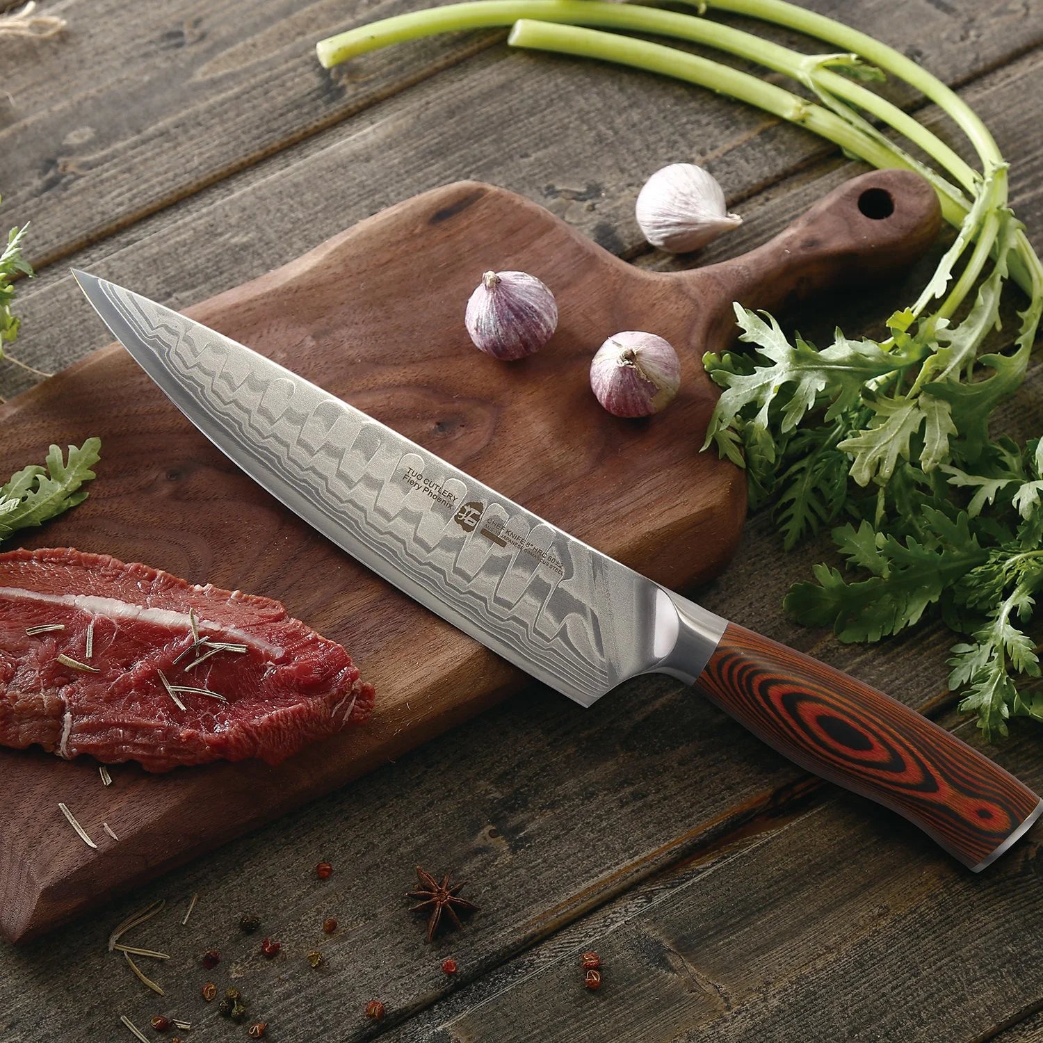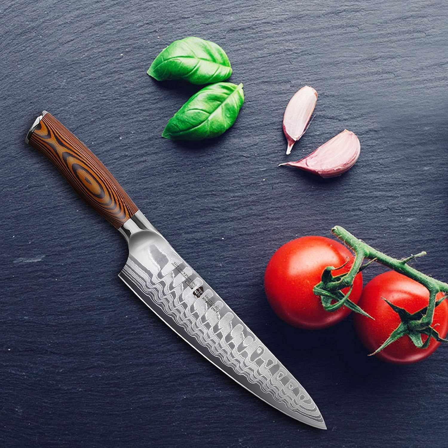 - SUPER ACERO: Adoptado acero de alto carbono AUS-10 de alta calidad como núcleo de la hoja, intercalado con 66 capas de acero más suave, cuenta con un alto nivel de resistencia al óxido y un rendimiento duradero que presenta un impresionante patrón de quilla de dragón en la hoja. El acero se procesa con precisión con tratamiento térmico al vacío y tratamiento de enfriamiento de nitrógeno, alcanzando la alta dureza a 62+/-2 HRC y una gran retención de borde.