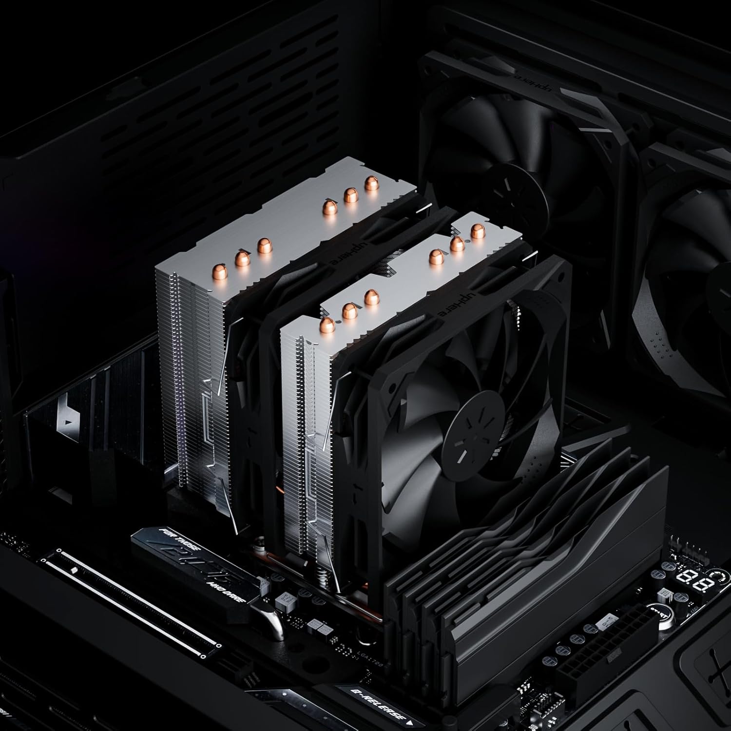 Rendimiento de refrigeración excepcional: cuenta con seis tubos de calor de 6 mm y torres duales, nuestro enfriador de CPU disipa el calor de forma eficiente de tu CPU para un rendimiento óptimo mientras juegas blackmyth wukong. Mejora la capacidad de disipación de calor con dos torres y un área de contacto directo de tubo de calor de 30 mm, el enfriador para PC garantiza una refrigeración efectiva incluso bajo cargas de trabajo pesadas.