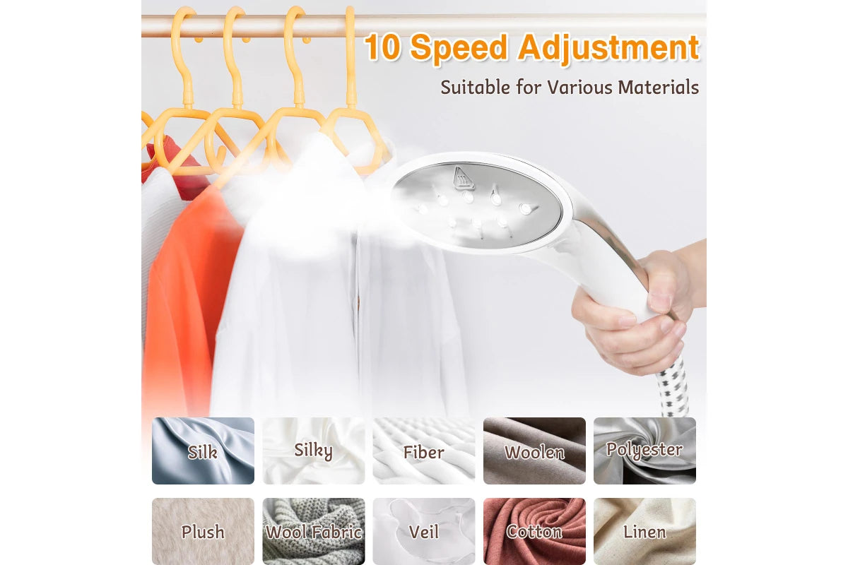 - 10 niveles de vapor: Nuestro innovador vaporizador de ropa de pie ofrece diez niveles de vapor ajustables, lo que le permite elegir la intensidad más adecuada para diferentes tejidos, incluyendo seda, algodón, lino, mezclas de nylon, lana, camisas, camisetas, cortinas y denim, entre muchos otros. Garantiza resultados óptimos mientras protege la ropa contra daños por calor.