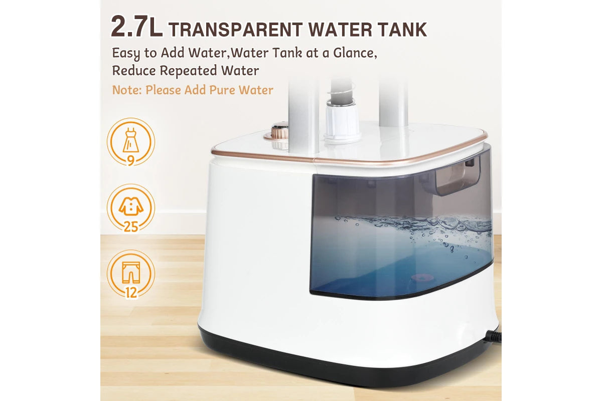 - Depósito de agua extraíble de 2,7 L: Este vaporizador de pie viene con un gran tanque de agua extraíble transparente de 2,7 L que proporciona 90 minutos de vapor continuo con una visión clara del agua restante. Ya sea que se esté preparando para un evento importante o abordando la ropa de una semana, puede pasar menos tiempo llenando el agua y más tiempo cocinando su ropa.