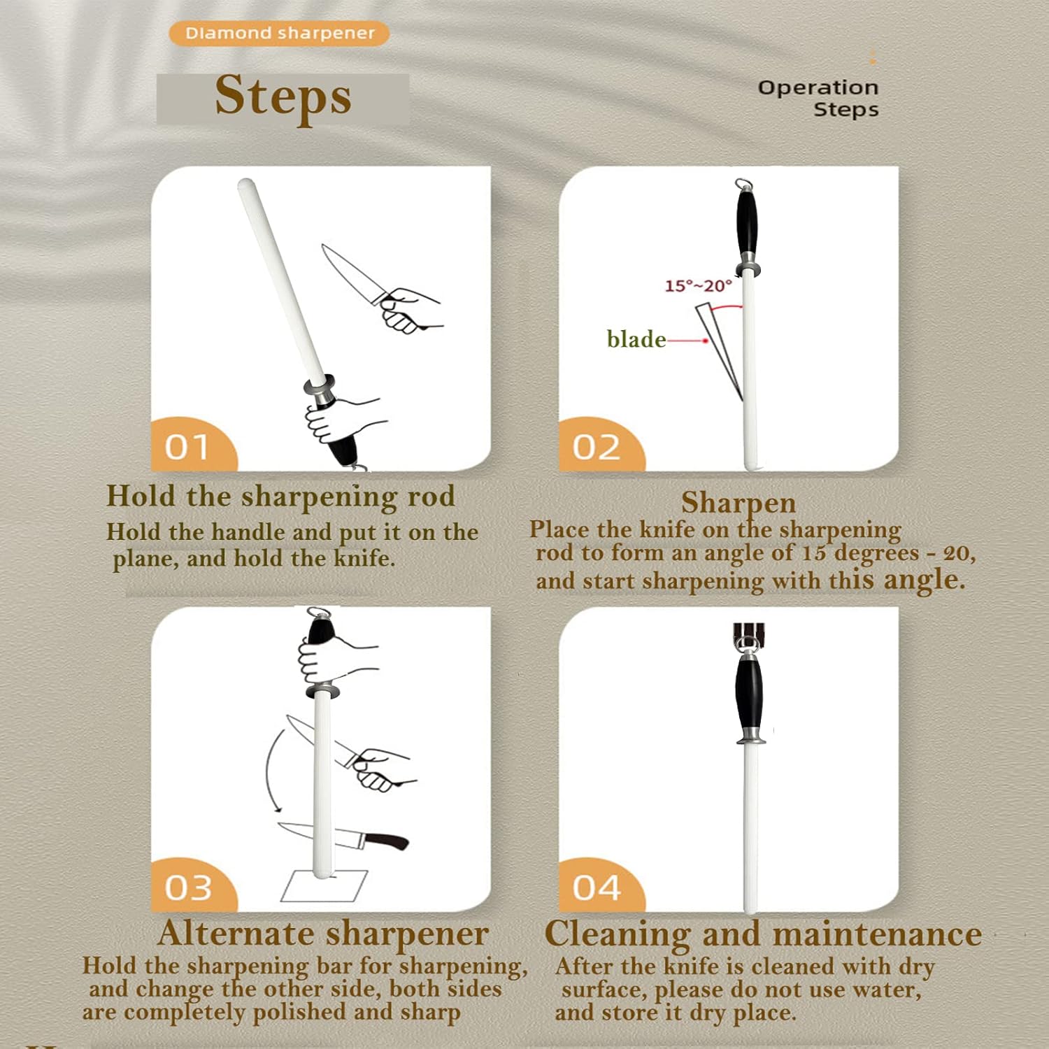 - 5. Para limpiar: aunque no es necesario lavar la varilla de afilar cerámica después de cada uso, se recomienda limpiar el acero con un paño húmedo para quitar las partículas de metal.