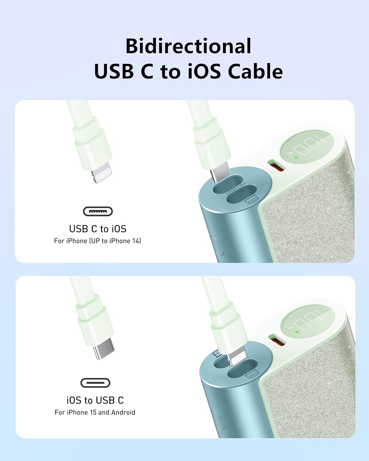 - Diseño minimalista: el cargador portátil con un cable bidireccional integrado, alimentando su iPhone y Android, u otros dispositivos USB-C todo en uno, el innovador cable también sirve como un cordón para la portabilidad.