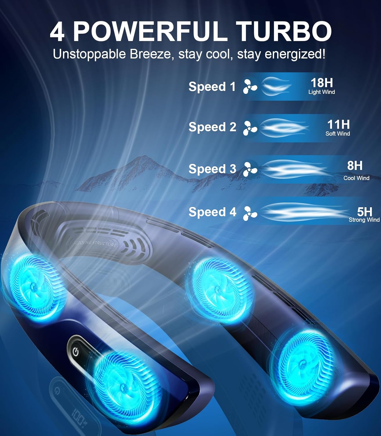 - 4 turbos y velocidades ajustables: el ventilador de cuello portátil BEYYON cuenta con 4 turbinas de alta velocidad sin aspas que aumentan el flujo de aire en un 200%. Soplado envolvente de 360° para una refrigeración de aire más uniforme. Las velocidades de viento ajustables te mantienen fresco y cómodo, ya sea una brisa suave para ayudarte a dormir o una brisa súper fuerte para un caluroso partido de fútbol al aire libre de verano