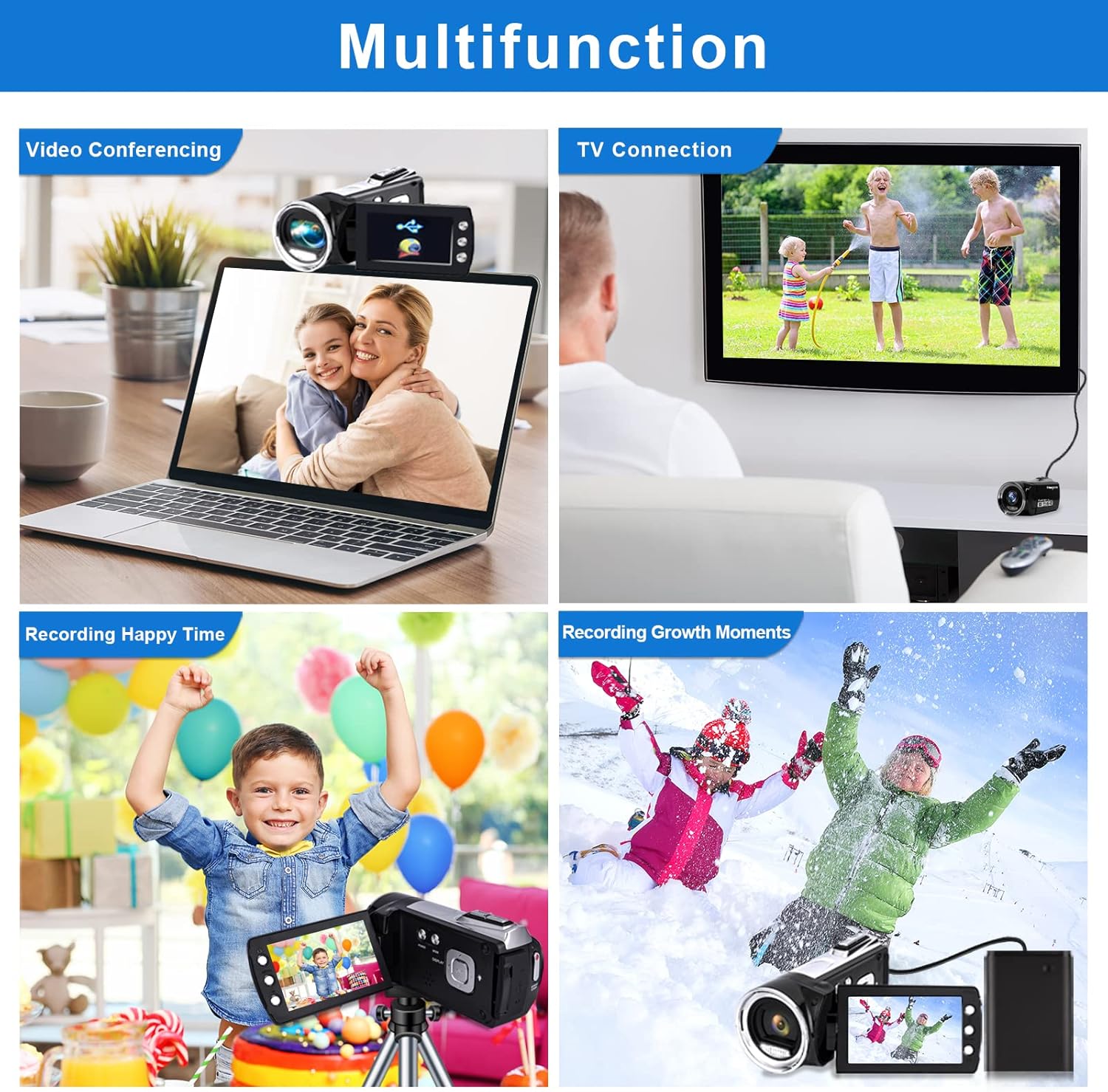 - FUNCIÓN DE CÁMARA WEB Y LUZ DE RELLENO: Esta cámara grabadora de video está equipada con luz de relleno, puede tomar imágenes o videos en condiciones de poca luz o en la oscuridad; Esta cámara de vlogueo se puede utilizar como una cámara web para la transmisión en vivo de YouTube/Skype/TikTok/Facebook o hacer videollamadas con su familia o amigos; también puede conectar la cámara de video digital al televisor a través de un cable USB para reproducir fotos o videos.