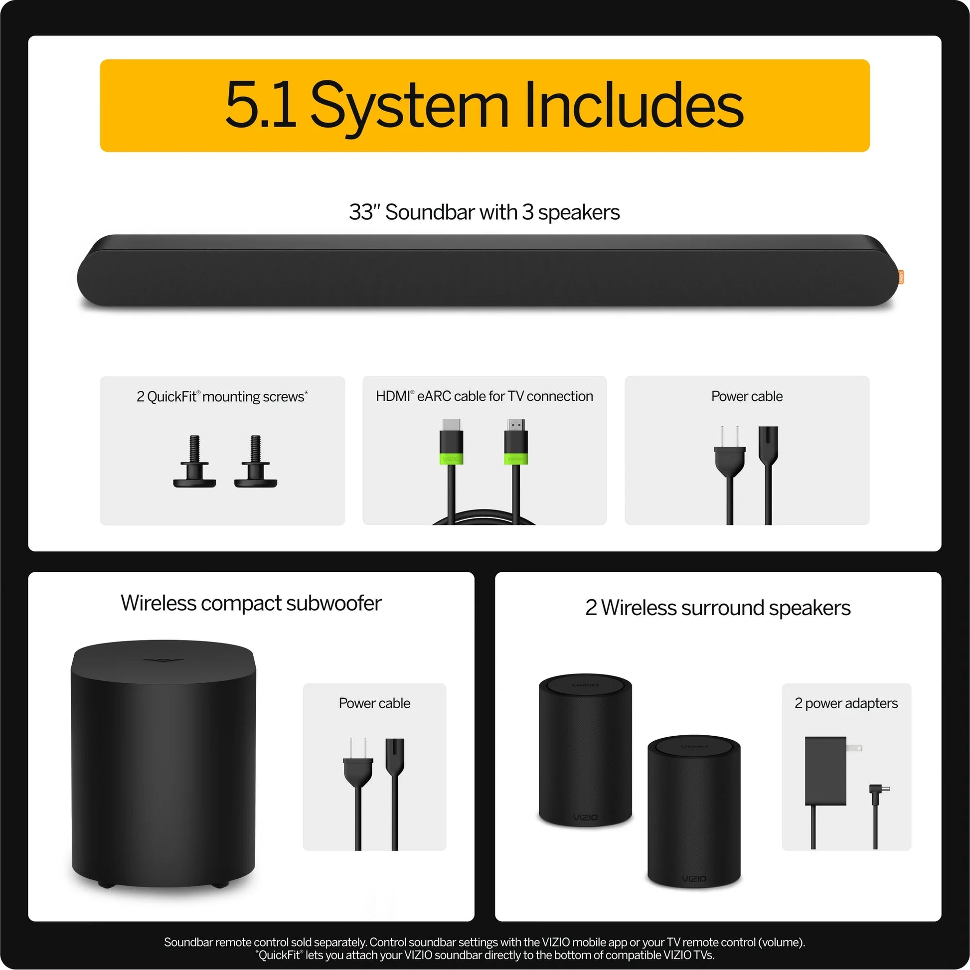 VIZIO Barra de Sonido 5.1 con Dolby Atmos, Altavoces Envolventes Inalámbricos y Subwoofer Compacto, Compatible con Ajuste Rápido (Nuevo) SV510XW-0906.