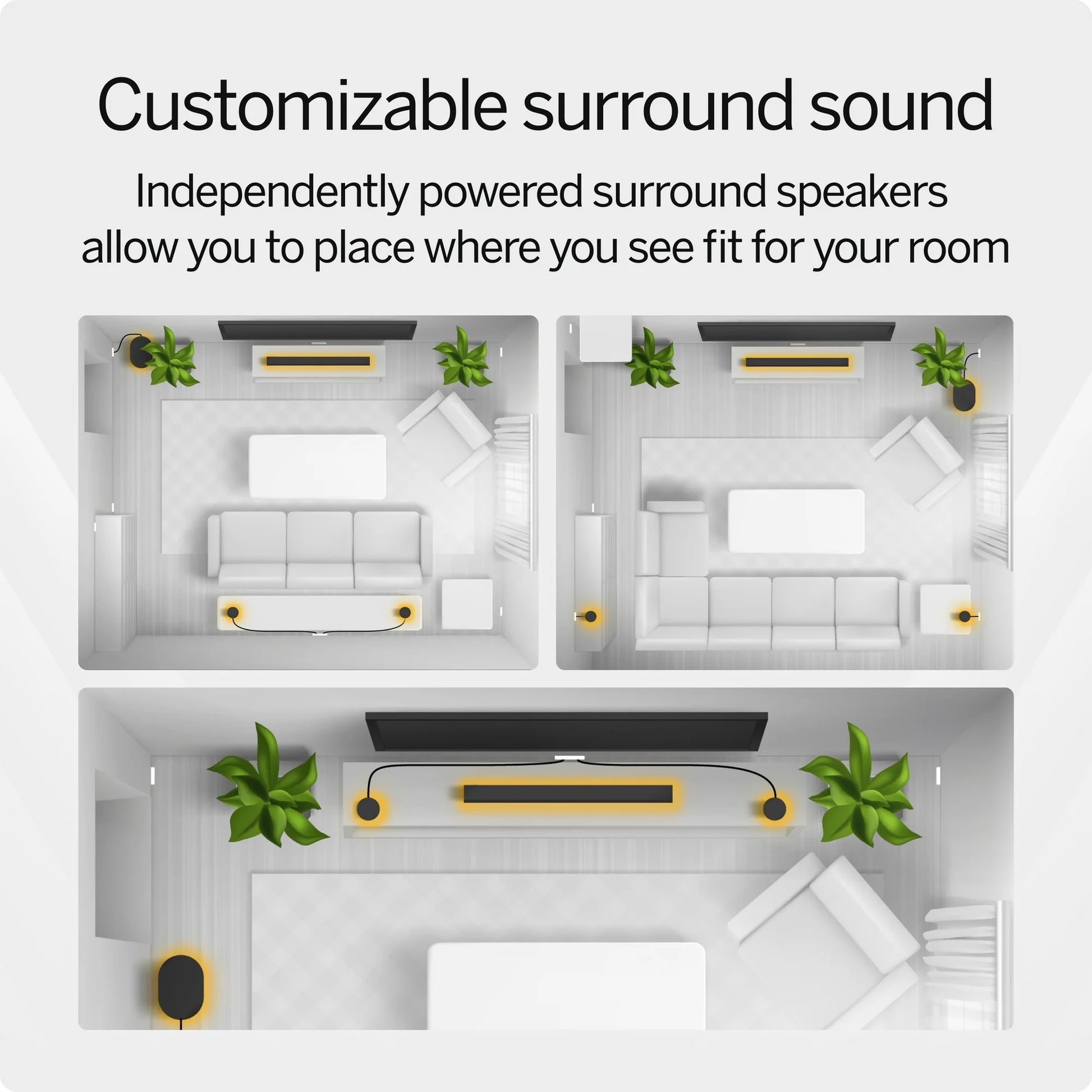 - Sonido envolvente flexible: los altavoces envolventes sin varillas y el subwoofer le brindan la libertad de organizar su sonido envolvente perfectamente adaptado a la distribución de su habitación y se emparejan previamente con la barra de sonido. Simplemente conéctelo y el 5.1 está listo para ofrecer un sonido claro y potente.