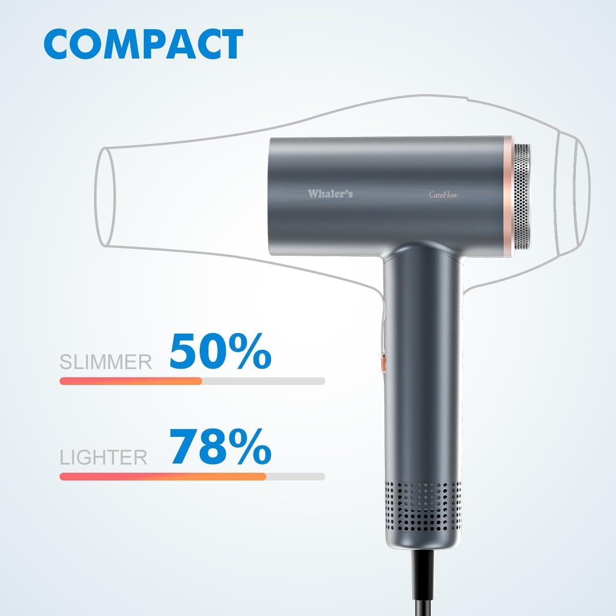 - Secador de pelo de iones negativos: el secador de pelo WHALER'S tiene 200 millones de iones negativos para dejar el cabello sedoso y sin encrespamiento. La tecnología iónica repele el agua, bloquea la humedad y le da a tu cabello un brillo natural saludable. Secado rápido: el secador de pelo WHALER'S está equipado con un motor sin escobillas de alta velocidad de 105,000 rpm con una velocidad de aire de 68.9 ft/s. El potente flujo de aire seca tu cabello en un corto período de tiempo, mucho más rápido que los secadores de pelo tradicionales.