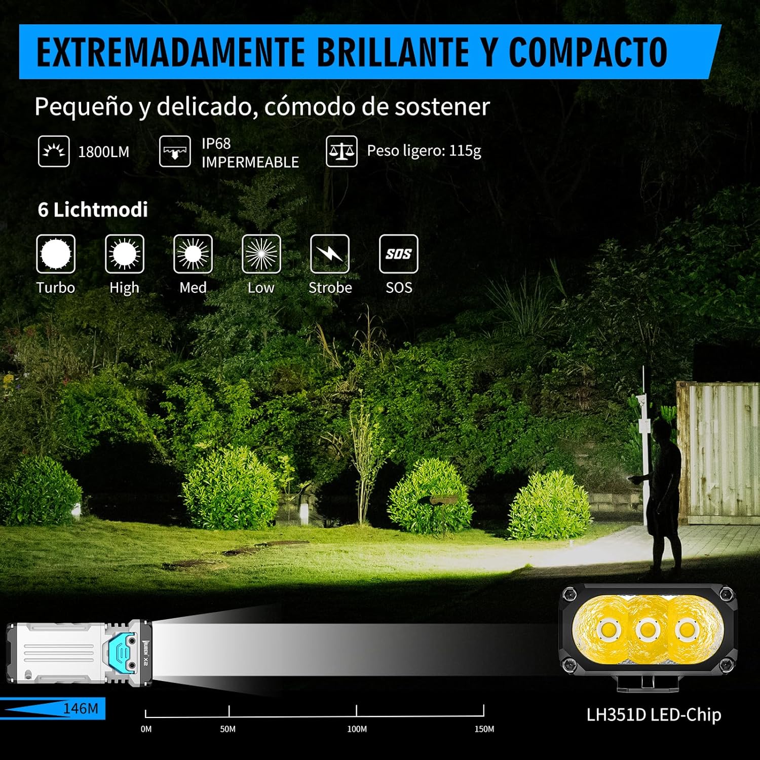 WUBEN X2 Linterna LED Recargable, 1800 lúmenes.