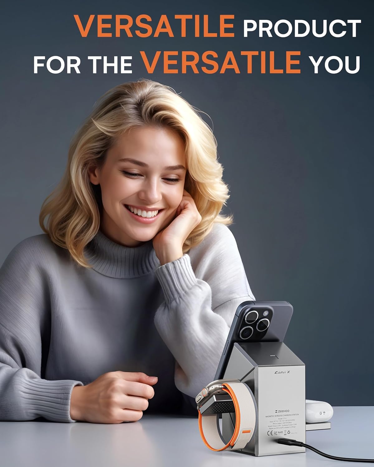 - Carga rápida de 15 W con certificación Qi2: carga tu iPhone, Apple Watch y AirPods simultáneamente con carga inalámbrica rápida de 15 W. Esta estación de carga para iPhone con certificación Qi2 garantiza una alimentación segura, eficiente y fiable para todos tus dispositivos Apple